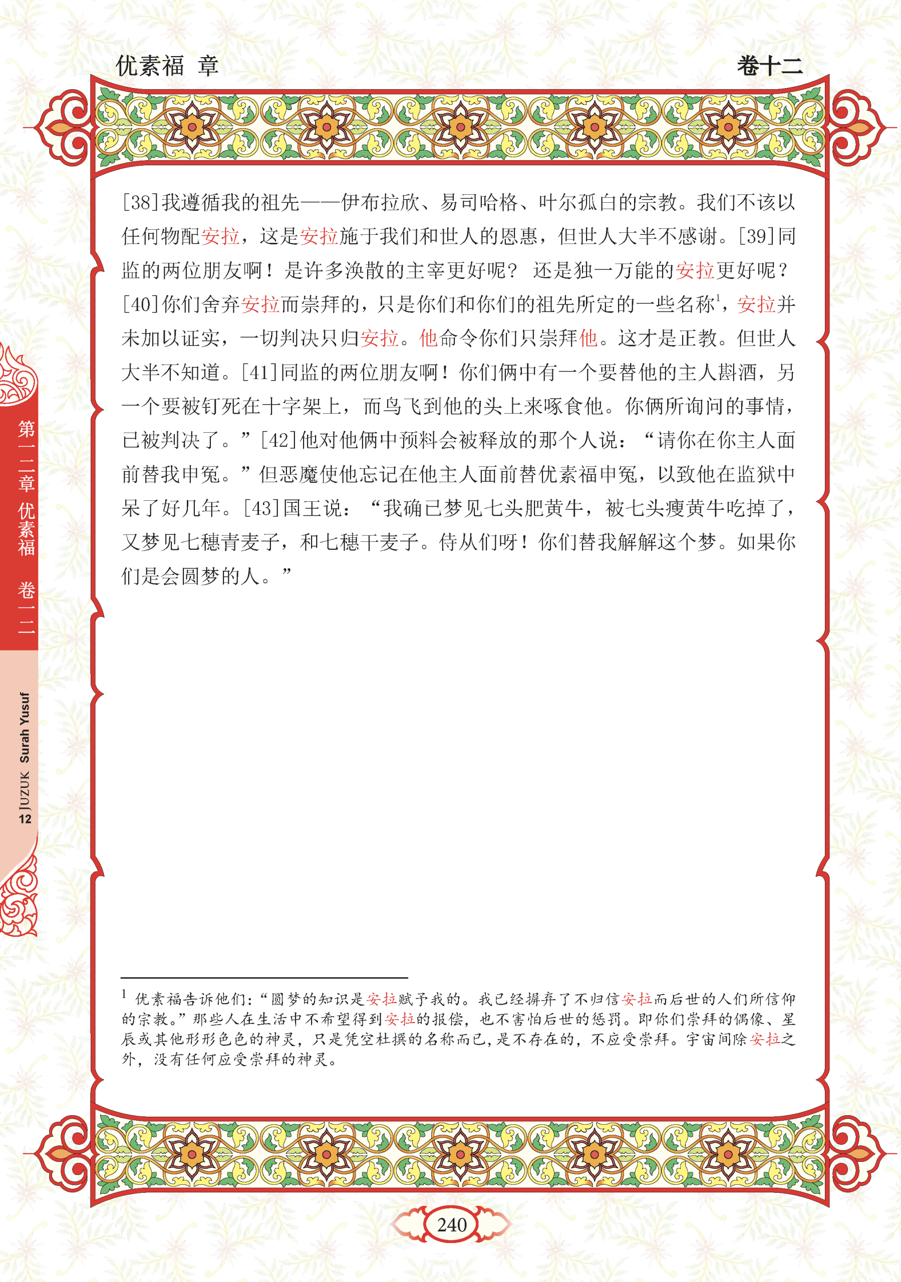 38. “Dan aku mengikuti agama nenek moyangku, Ibrahim, Ishak serta Yaakub. Tidaklah sepatutnya kita mempersekutukan Allah dengan sesuatu pun. Itulah dia hasil daripada limpah kurnia Allah kepada kita dan kepada umat manusia, tetapi kebanyakan manusia tidak bersyukur.”